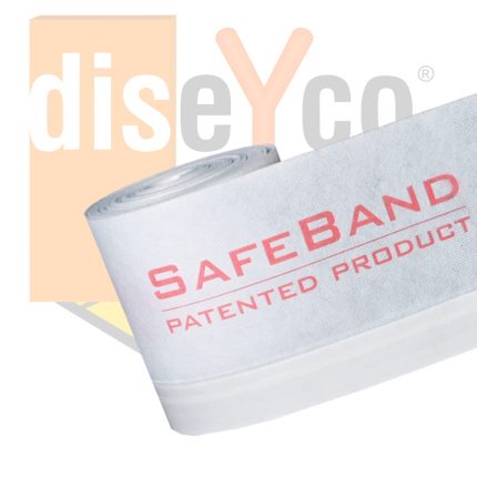 Banda selladora multiaxial SAFEBAND de Estil Guru para impermeabilización de juntas en platos de ducha, bañeras y sanitarios. Cumple DIN 18534. Fijación con cemento cola. Disponible en rollos de 2, 3,5, 6 y 30 m. Distribución en diseyco.es.