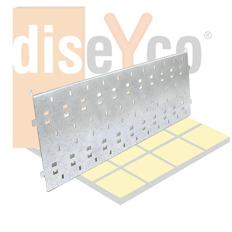 Panel de acero galvanizado sujeto a dos soportes entre los montantes del sistema Pladur. A este panel se pueden fijar mediante bridas o tornillos todo tipo de instalaciones. Mediante sus accesorios se adapta a las necesidades de altura y profundidad. De acero galvanizado 0,8 mm y en forma de U. Con multitud de perforaciones para la sujección de cajas de luz, tubos, cables…