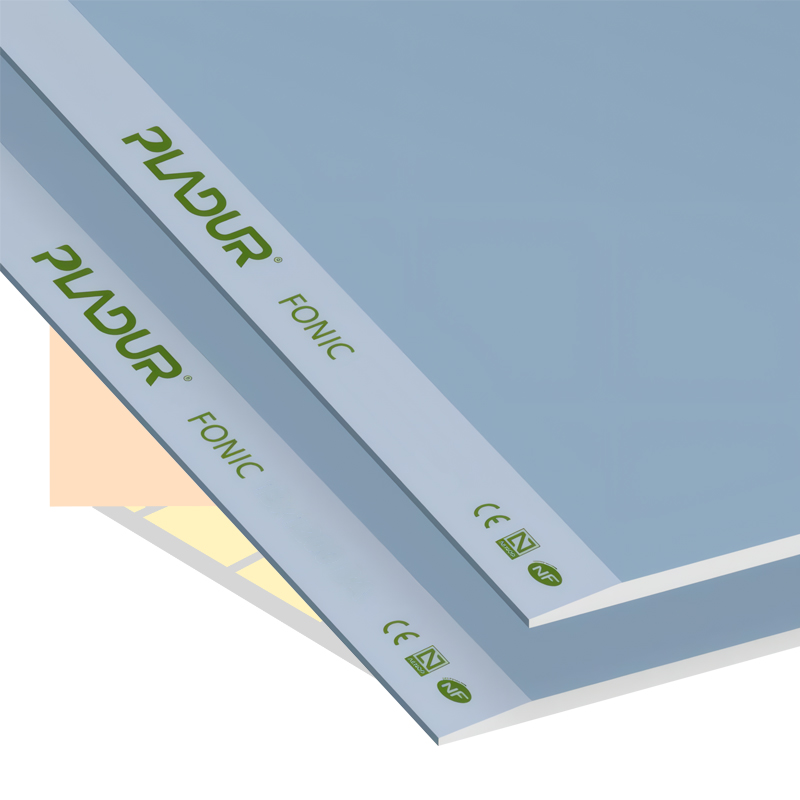 Placa de yeso laminado Pladur FONIC formada por dos láminas de cartón y alma de yeso deshidratado y reforzado con fibras minerales y aditivos especiales que le confieren propiedades altas de aislamiento acústico.